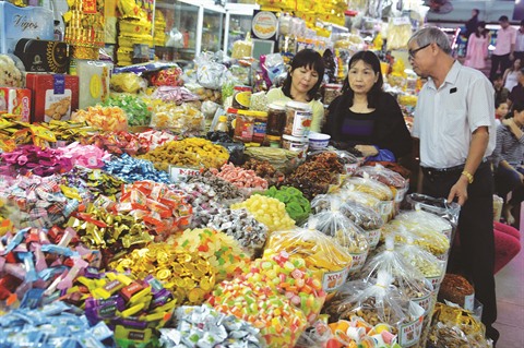 | Les supermarchés et marchés traditionnels débordent de friandises et marchandises au service du Têt. |