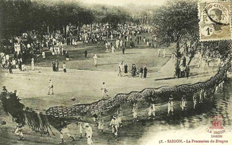 Une danse du dragon est effectuée sur le boulevard Charner, qui porte aujourd’hui le nom de la rue Nguyên Huê (1er arrondissement de Hô Chi Minh-Ville). Plus de 25 personnes manipulent ce dragon de 50 mètres de long. La photographie a probablement été prise avant 1905. Cette danse traditionnelle est censée porter chance pour l’année à venir.