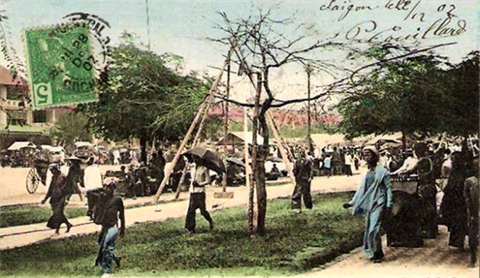 Les piétons marchent le long du boulevard Charner (aujourd’hui la rue Nguyên Huê) en 1902.