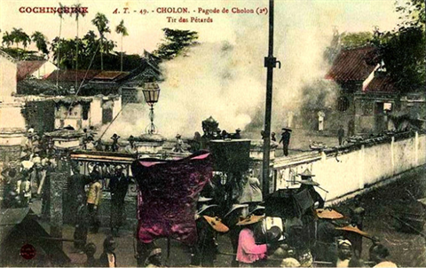 Les pétards (utilisés pour célébrer le Têt) sont allumés dans la cour d'une pagode du quartier chinois (Cho Lon), en 1905. Cette photographie a probablement été prise dans la pagode Phu Nhi ( 264 rue Hai Thuong Lang Ong, 5e arrondissement).