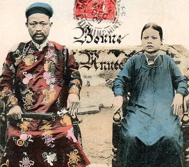 Un mandarin vietnamien est assis à côté de sa femme pendant le Têt. Entre les deux personnes sont inscrits en français «Bonne Année» et un tampon datant de 1901. Ils sont tous deux vêtus d’une tenue traditionnelle. L'homme porte ainsi un turban, une tunique et des chaussures en tissu. La femme quant à elle a revêtu un ao dài (robe traditionnelle des vietnamiennes).