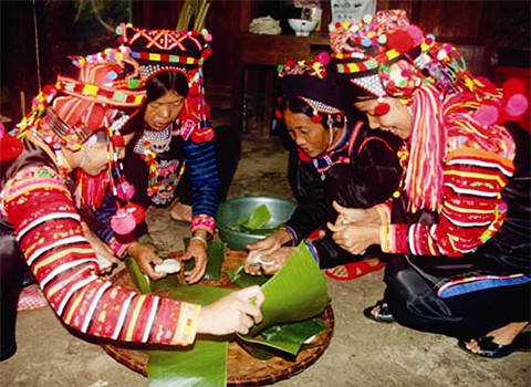 | La préparation de banh giây et banh chung – des gâteaux qui symbolisent le Ciel et la Terre. |