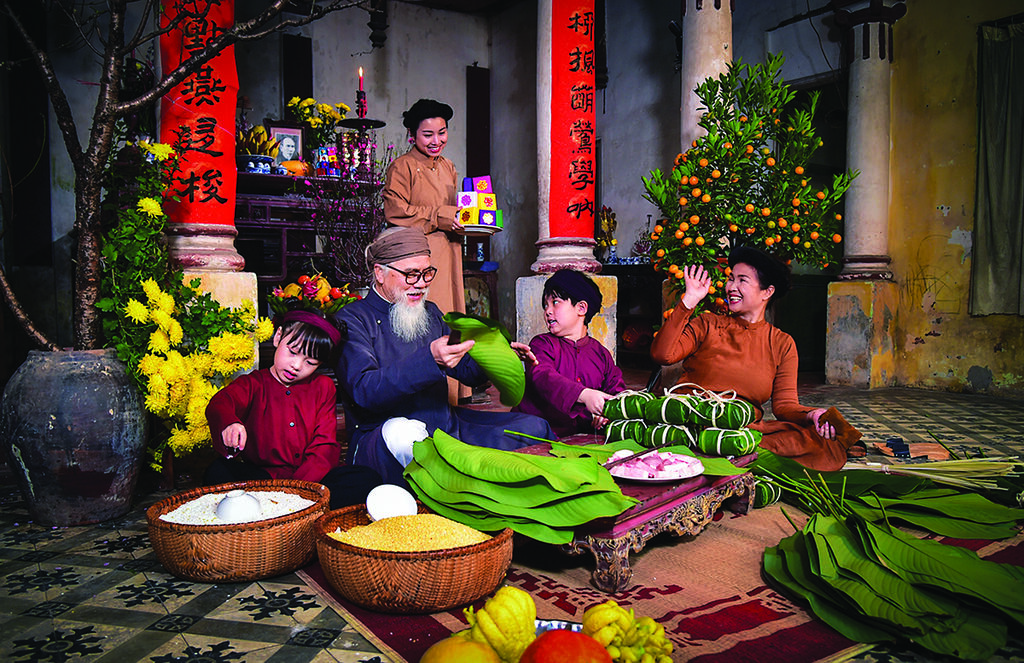 L’image la plus émotionnelle du Têt est l’ambiance enthousiaste lorsque la famille entière se rassemble autour d’une marmite de bánh chung cuisant sur le feu ardent ou encore lors du festin le jour de l’an lunaire en présence de tous les membres de la famille.