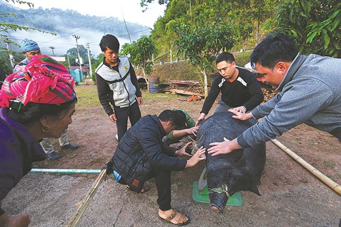 "Cette année, ma famille tue un cochon plus gros que l’année dernière, car on a plus d’invités. Tôt le matin, belles-filles et beaux-fils se réunissent pour cette tâche. La viande sera le plat principal pour inviter les proches et les voisins", confie Po Po Son, du village de Ta Khô Khu, commune de Sin Thâu.