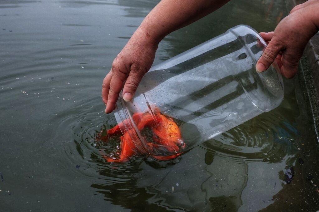 | Relâcher la carpe après le culte des Génies du foyer. |