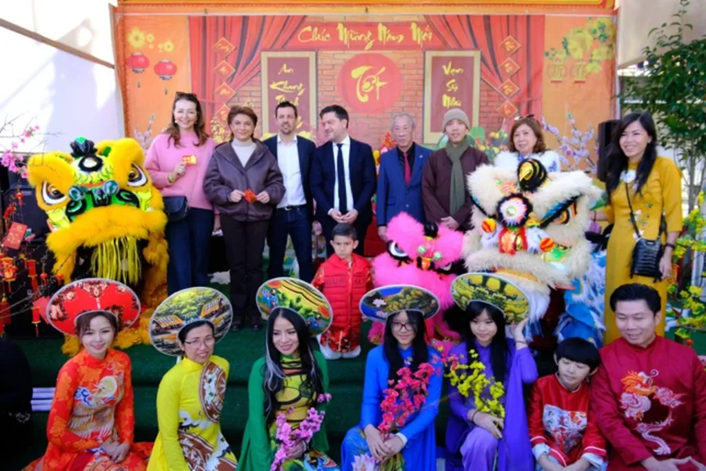 Malgré la fraîcheur hivernale, certaines femmes vietnamiennes choisissent de revêtir l’ao dài traditionnel, affirmant avec élégance leur identité culturelle. Ces silhouettes graciles, mêlées aux couleurs printanières, contribuent à projeter une image raffinée du Vietnam au cœur de l’Europe.