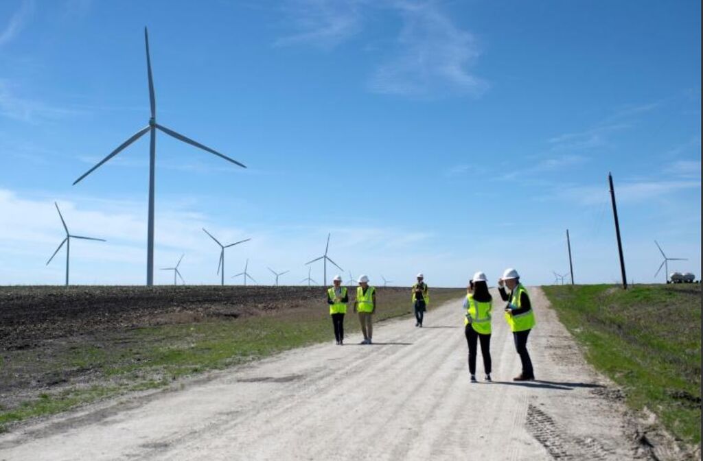 | Des employés d'Engie en visite d'un champ d'éoliennes pour le projet Limestone Wind, à Dawson au Texas (Sud des États-Unis), le 28 février 2023. |