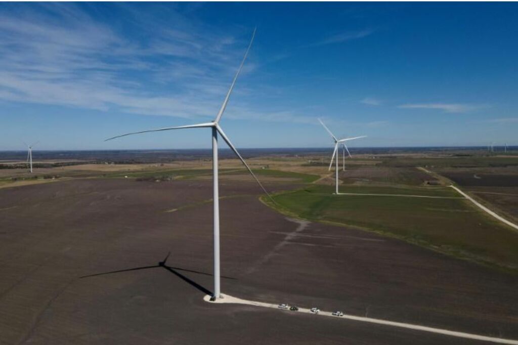| Vue aérienne d'éoliennes du projet Limestone Wind, à Dawson au Texas (Sud des États-Unis), le 28 février 2023. |
