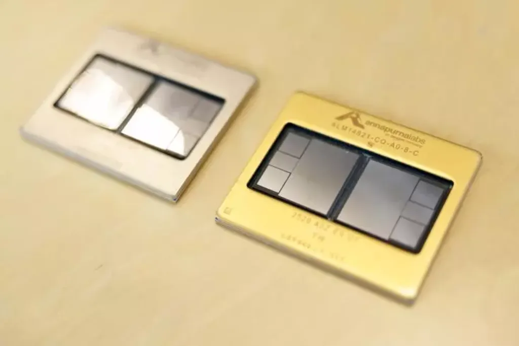 | Les processeurs Trainium 2 (gauche) et Trainium 3 (droite) d'Amazon Web Services. |