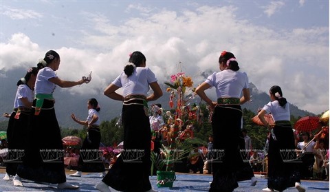 | Des femmes Thai blancs dansent autour de la plante nêu pour vanter le mérite des Then lors de la fête Kin Pang à Phong Tho, province de Lai Châu. |