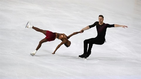 | Le couple français Vanessa James et Morgan Ciprès lors du programme court des Internationaux de France de patinage artistique, le 23 novembre à Grenoble. |