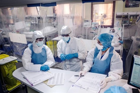| Des membres d'une équipe médicale dans l'unité de soins intensifs à l'hôpital franco-britannique de Levallois-Perret, dans la banlieue de Paris, le 9 avril. |