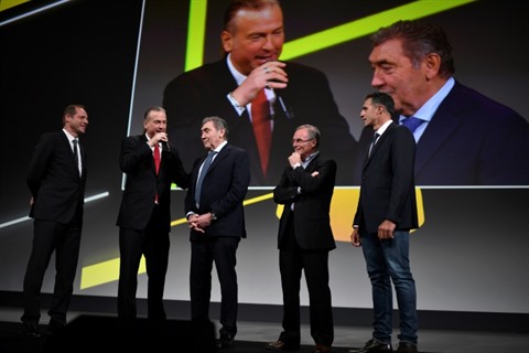 | Le directeur du Tour, Christian Prudhomme (gauche), présente le Tour de France 2019 à Paris, le 25 octobre. |