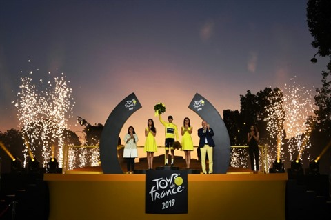 | Le vainqueur du Tour de France 2019, le Colombien Egan Bernal (centre), sur le podium à Paris, le 28 juillet. |
