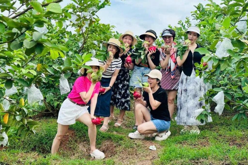 | Des touristes profitent d’une activité de cueillette de fruits à Khe Mai Farm. |