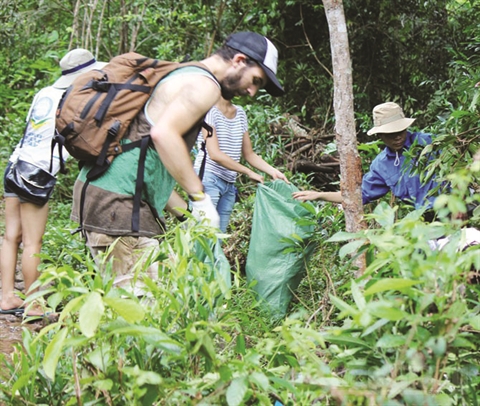 | Des touristes et des jeunes collectent des déchets dans la zone touristique de Khe Rô. |
