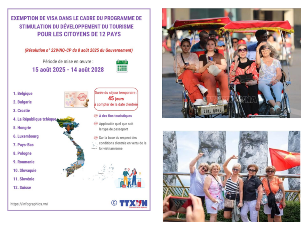 En particulier, le gouvernement a récemment promulgué la Résolution n°229/NQ-CP du 8 août 2025 sur l’exemption de visa dans le cadre du programme de relance du tourisme, au bénéfice des citoyens de 13 pays européens : Royaume de Belgique, République de Bulgarie, République de Croatie, République tchèque, Hongrie, Grand-Duché de Luxembourg, Royaume des Pays-Bas, République de Pologne, Roumanie, République slovaque, République de Slovénie et Confédération suisse. Conformément à cette mesure, les ressortissants de ces pays sont exemptés de visa pour une durée de 45 jours à compter de leur entrée sur le territoire, à des fins touristiques, quel que soit le type de passeport, sous réserve de remplir les conditions d’entrée prévues par la législation vietnamienne.