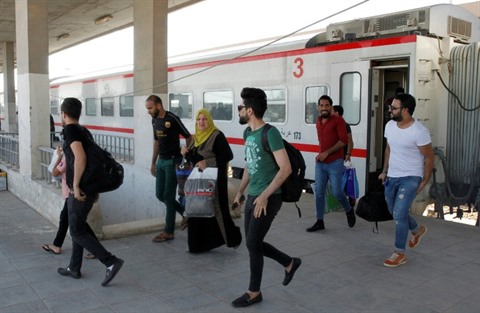 | À la gare de Fallouja en Irak, des Irakiens descendent du train en provenance de Bagdad, le 19 août. |