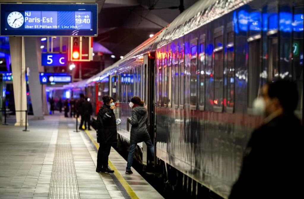 | Des passagers embarquent à bord du train Nightjet Paris-Vienne, le 13 décembre 2021 à la gare centrale de Vienne. |