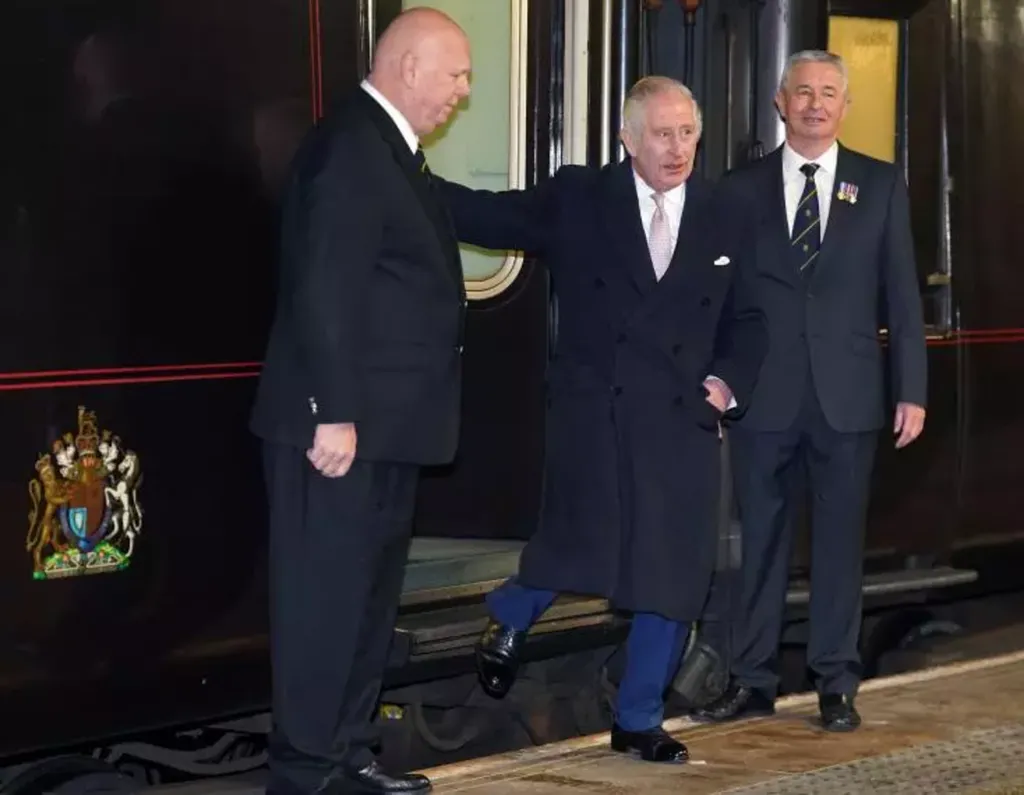 | Le roi Charles III sort du train royal, le 20 janvier 2023 à la gare Victoria de Manchester (Royaume-Uni). |