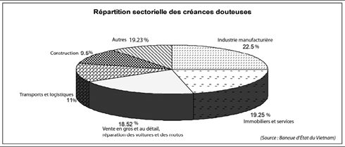 Le gouverneur Nguyên Van Binh a indiqué les six secteurs économiques les plus fortement débiteurs (voir l’infographie) qui représentaient à eux seuls 96.000 milliards de dôngs de créances douteuses fin juin 2012, soit 80,5% du total national.