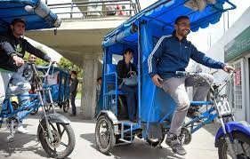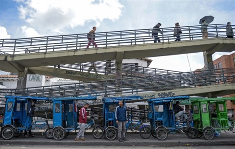 | Conduire un vélotaxi est l'un des petits boulots occupés à Bogota par des Venezuéliens ayant fui leur pays en crise |