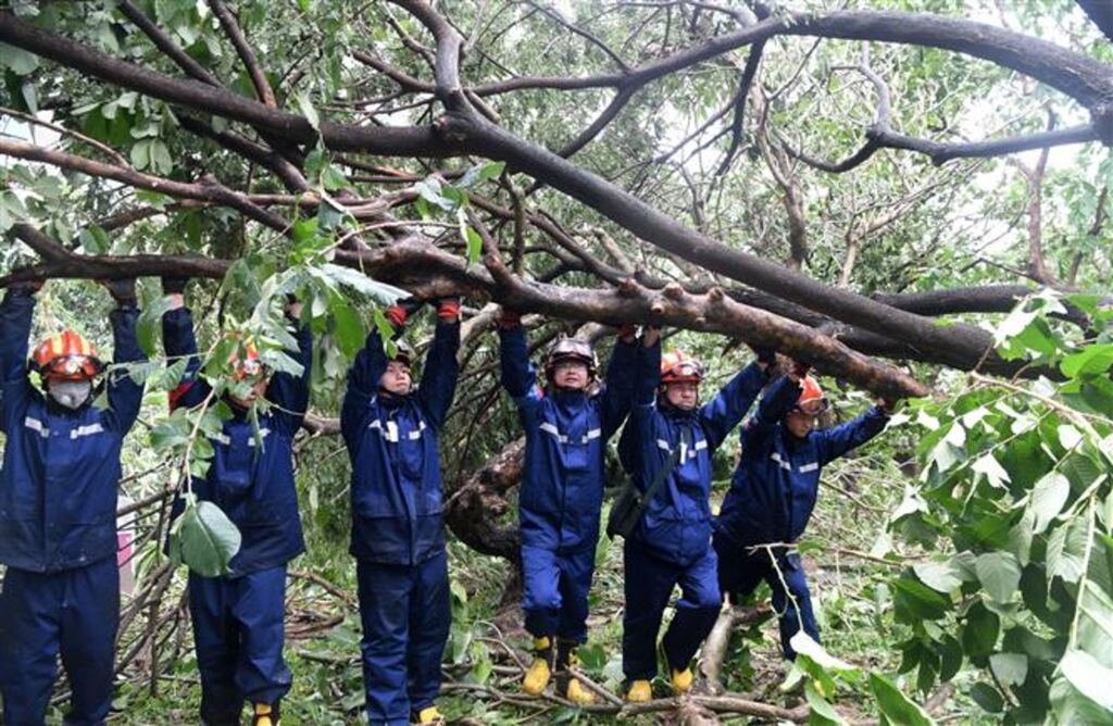| Des sauveteurs nettoient une route à Sanya, à Hainan, en Chine, le 25 août. |