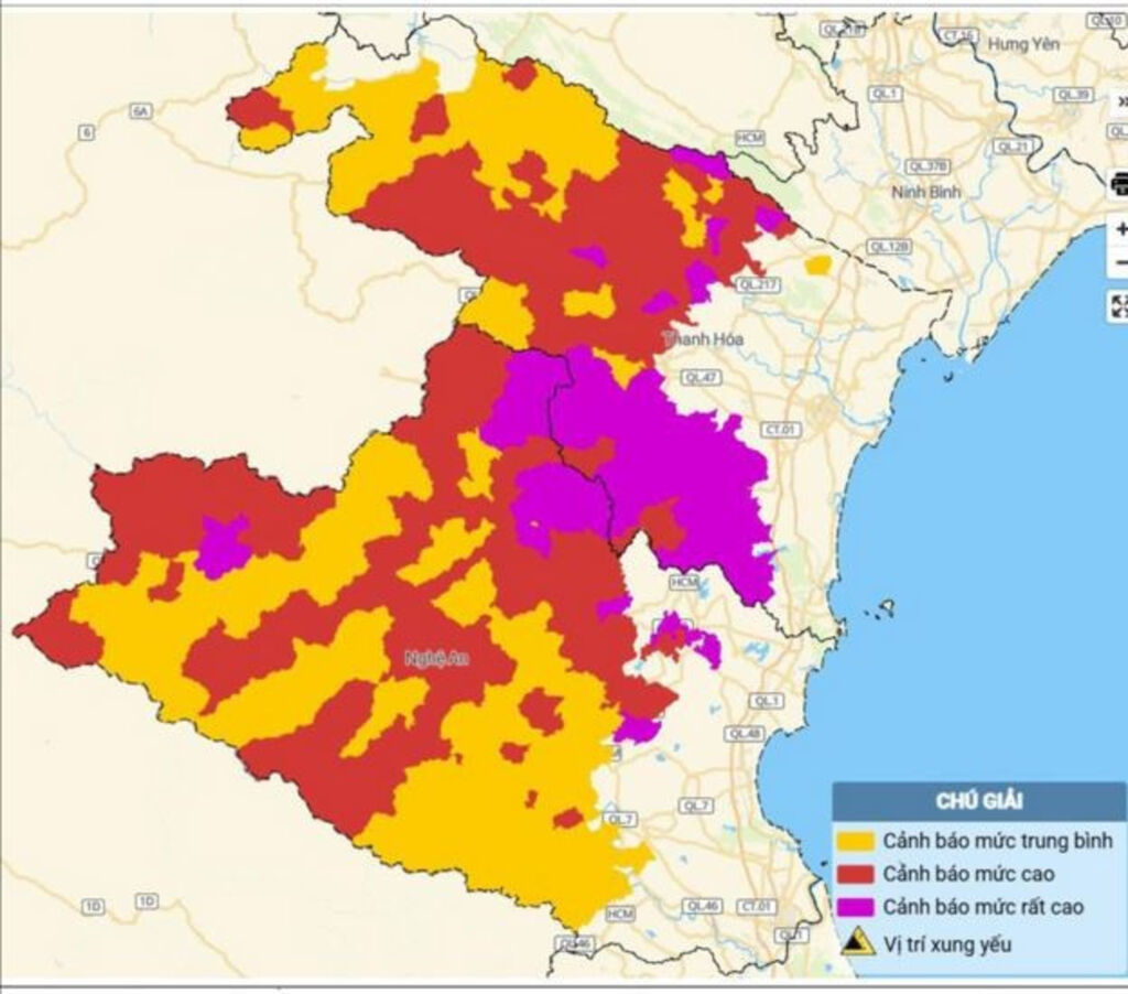 | Carte montrant les zones à risque d’inondations soudaines et de glissements de terrain dans les provinces de Nghê An et Thanh Hoa. |