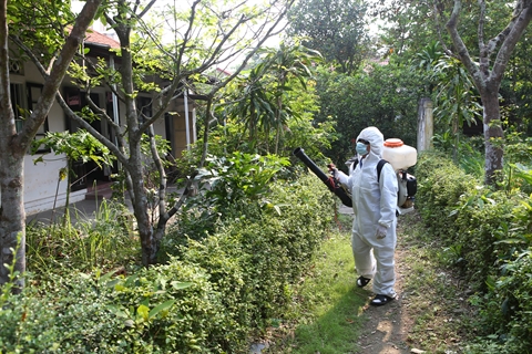| Un agent sanitaire de la province de Thua Thiên-Huê (Centre) traite un jardin pour lutter contre la prolifération des moustiques vecteurs de la dengue. |