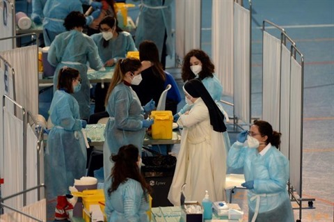 | Une religieuse vient se faire vacciner contre le COVID-19 dans le centre sportif de l'université de Séville (Espagne), le 24 février. |