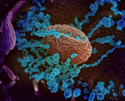 | Image microscopique du SARS-CoV-2 (en bleu) émergeant de la surface de cellules cultivées en laboratoire. |