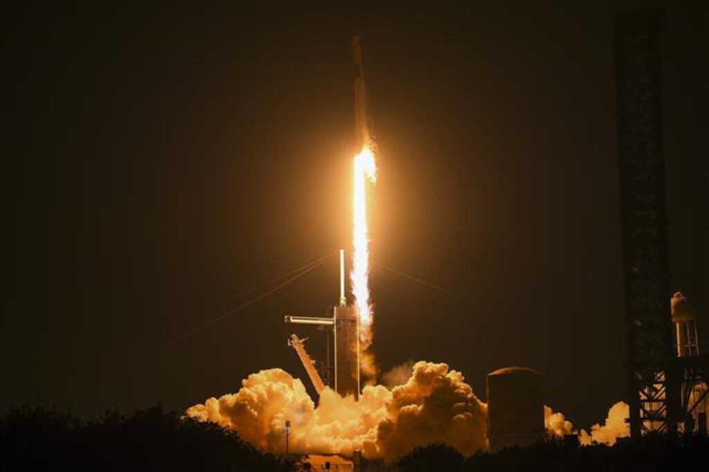 | La fusée Falcon 9 transportant le vaisseau spatial Crew Dragon quitte la rampe de lancement au Kennedy Space Center, en Floride (États-Unis), le 2 mars. |