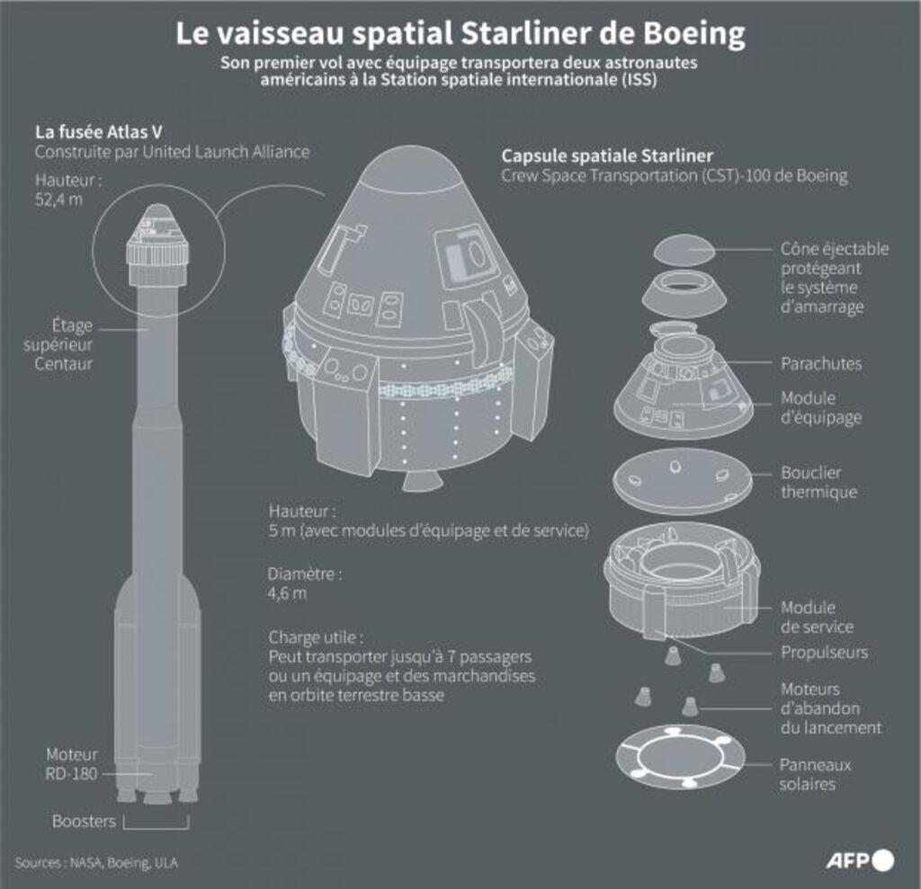 | Infographie sur le vaisseau spatial Starliner de Boeing qui s'apprête à effectuer sa première mission avec équipage vers la Station spatiale internationale. Photo : AFP/VNA/CVN |