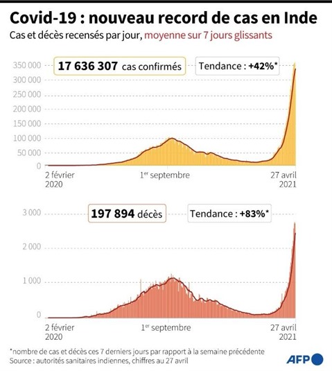 | Cas de COVID-19 et décès quotidiens liés au COVID-19 officiellement recensés en Inde au 27 avril. |