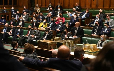 | Photo fournie par le parlement britannique montrant le ministre de la Santé Sajid Javid lors du débat sur le vote des mesures visant à enrayer la progression d'Omicron le 14 décembre. |