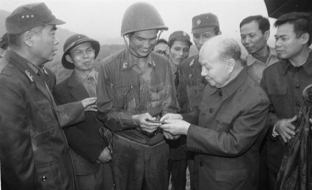 | Truong Chinh rend visite aux soldats sur un poste de garde avancé dans la province de Lang Son (1984). |