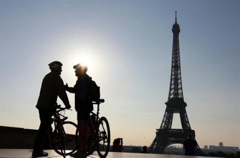 | Deux cyclistes discutent devant la tour Eiffel avant de participer à la "Journée sans voiture" organisée par la mairie de Paris, le 27 septembre. |