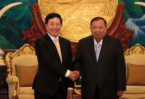 | Le président lao Bounnhang Volachith (droite) et le vice-Premier ministre et ministre des Affaires étrangères Pham Binh Minh, le 26 décembre à Vientiane |