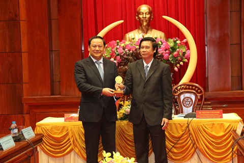 | Le secrétaire du Comité provincial du Parti de Tiên Giang, Nguyên Van Danh (droite), reçoit le vice-Premier ministre lao Sonexay Siphadone. |