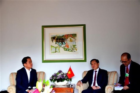 | Le vice-Premier ministre Lê Minh Khai (centre) rencontre le président du groupe indonésien ToGo, Andre Soelistyo, le 23 mai à Davos. |