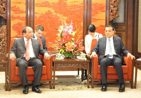 | Le vice-Premier ministre vietnamien Nguyên Xuân Phuc (gauche) et le Premier ministre chinois Li Keqiang, le 16 septembre à Pékin. |