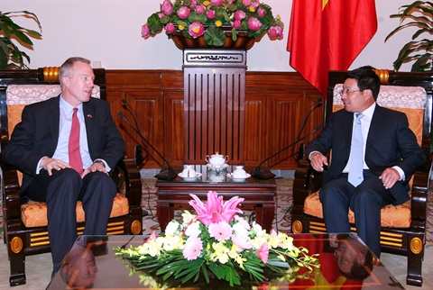 | Le vice-Premier ministre et ministre des Affaires étrangères Pham Binh Minh (droite) rencontre l'ambassadeur des États-Unis au Vietnam, Ted Osius, le 26 février à Hanoi. |