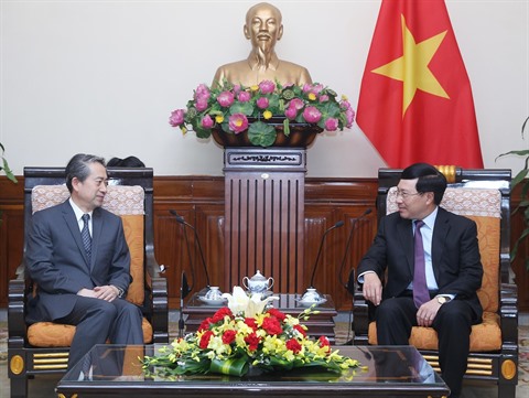 | Le vice-Premier ministre et ministre des Affaires étrangères Pham Binh Minh (droite) et l’ambassadeur de Chine au Vietnam, Xiong Bo. |