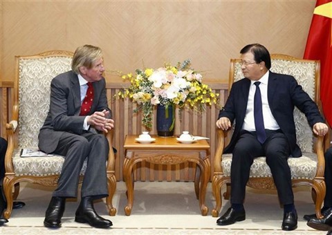 | Le vice-Premier ministre Trinh Dinh Dung (droite) et le directeur général du groupe britannique SOCO International, Ed Story |