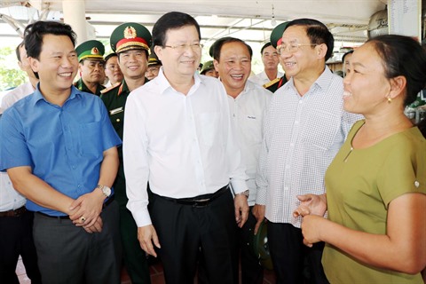 | Le vice-Premier ministre Trinh Dinh Dung (2e à gauche) rencontre une femme commerçante des produits aquatiques dans le district de Câm Xuyên. |