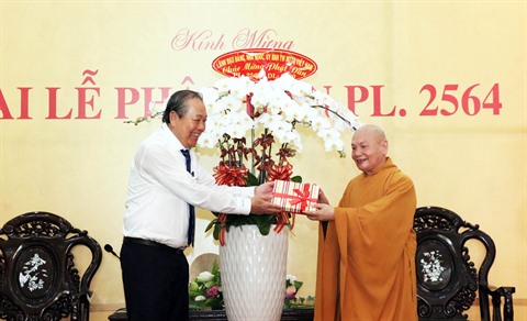 | Le vice-Premier ministre permanent Truong Hoà Binh (gauche) rend visite au bronze Thich Thiên Nhon, président du conseil d’administration de l’Église bouddhique du Vietnam, le 3 mai à Hô Chi Minh-Ville. |