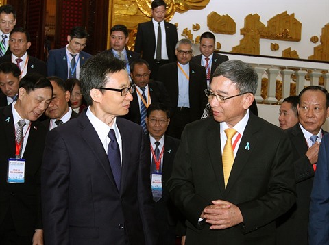 | Le vice-Premier ministre Vu Duc Dam (gauche) et des délégués participant à l'AMMD-6. |
