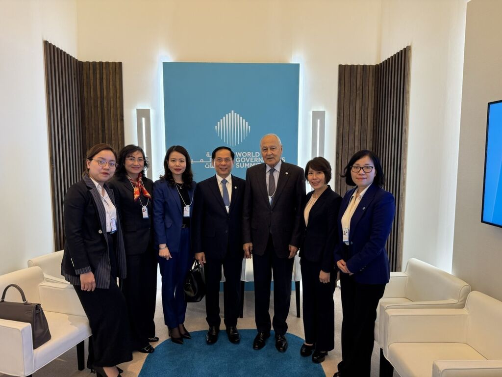 | Le vice-Premier ministre et ministre des Affaires étrangères Bùi Thanh Son (centre) et le secrétaire général de la Ligue arabe Ahmed Aboul Gheit (3e à droite) en marge du Sommet mondial des gouvernements 2025. |
