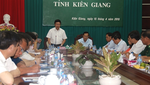 | Le vice-Premier ministre et ministre vietnamien des Affaires étrangères Pham Binh Minh (debout), prend la parole le 14 avril lors d'une séance de travail avec avec les autorités de Kiên Giang (Sud). |