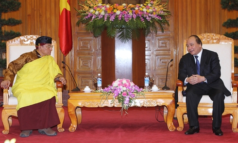 | Le vice-Premier ministre Nguyên Xuân Phuc (droite) et Sa Sainteté le 12e Gyalwang Drukpa, chef spirituel de la Lignée Drukpa au Népal, le 8 avril à Hanoi. |